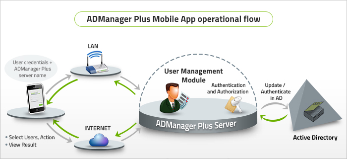 ADManager Plus Android app makes 'on the move' management of your Active Directory user accounts a reality. Armed with this app, you can now have a complete control over all your user accounts by being able to access and perform vital user management actions right from your mobile device, always.