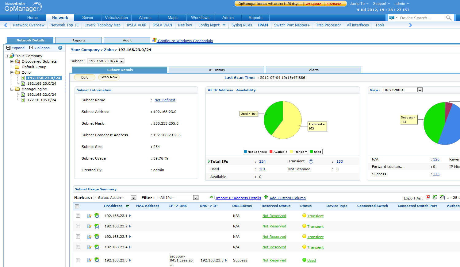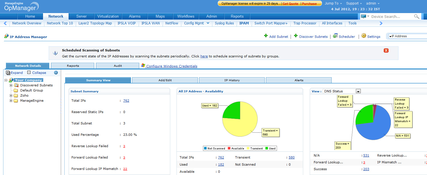 IP地址管理工具可以定期或者按需觸發(fā)對網(wǎng)絡的掃描,提供IP地址的狀態(tài)(保留、瞬態(tài)或可用)。它使用各種各樣的協(xié)議來掃描子網(wǎng),如ICMP、SNMP、WMI和DNS,獲取IP地址的明細信息。