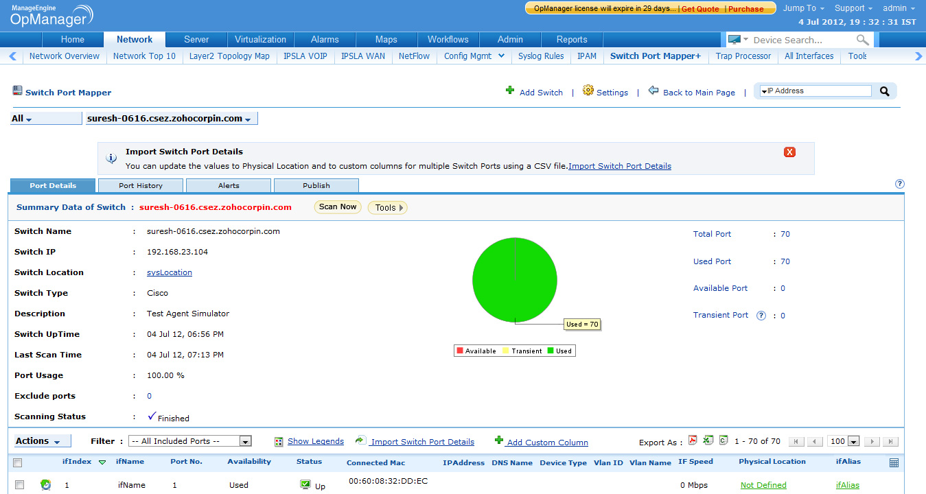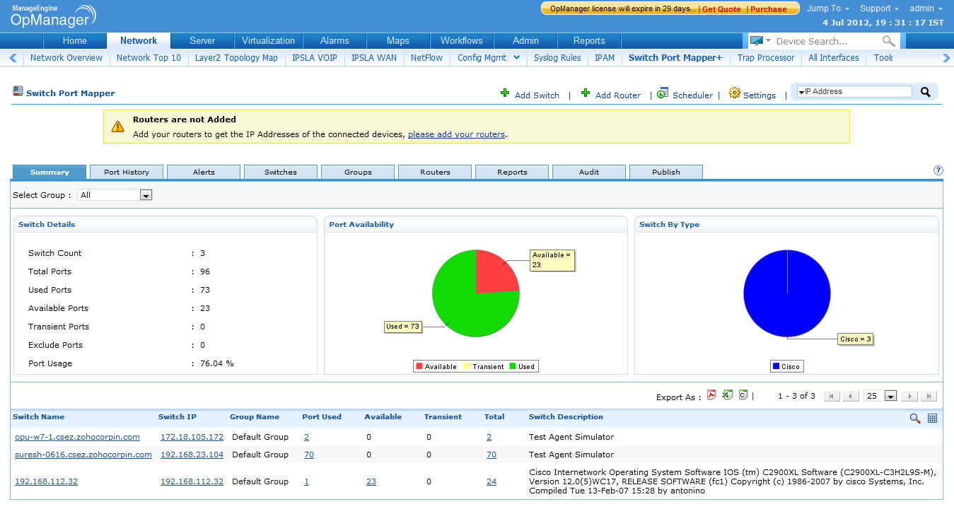 追蹤和管理IP地址,追蹤連接到指定交換機端口的設備和交換機中空閑的端口數(shù)量,是比較典型的日常網(wǎng)絡管理任務。使用電子表格或者單獨的工具來管理,會浪費掉不少的時間,而且還增加了任務的復雜程度。OpManager的IPAM和SPM插件為您帶來一個綜合的IP地址管理和交換機端口映射管理平臺。