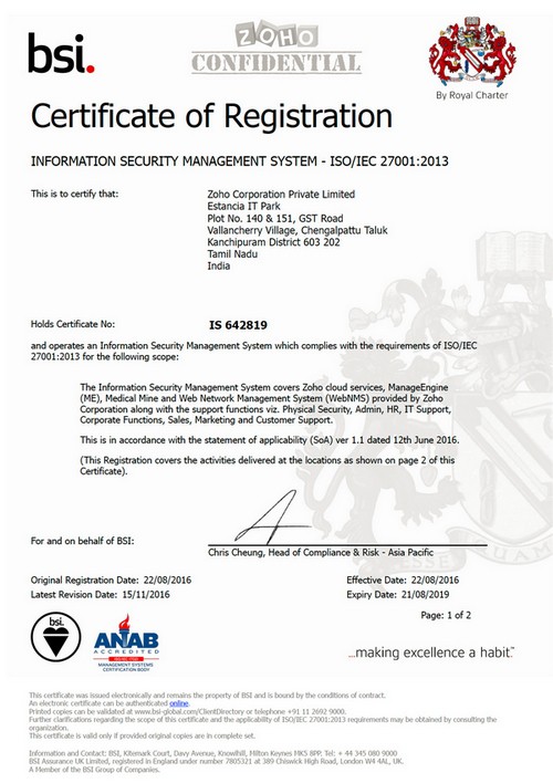 卓豪正式通過ISO27001信息安全管理體系認證,認證范圍涵蓋旗下三大產(chǎn)品線 - ManageEngine IT運維管理方案、Zoho云服務和WebNMS網(wǎng)管系統(tǒng)平臺以及公司相關服務資源,包括物理安全、行政、人事、IT支持、銷售、營銷和客服。
