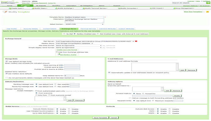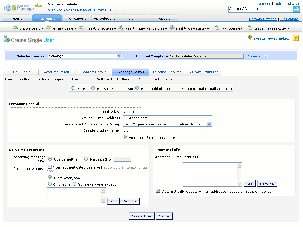 With ADManager Plus it is very easy to create mail-enabled users in bulk by just importing a CSV file. Also, administrators can set any kind of restriction on mail-enabled groups and contacts to prevent any security breach