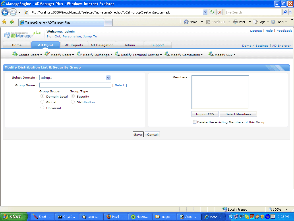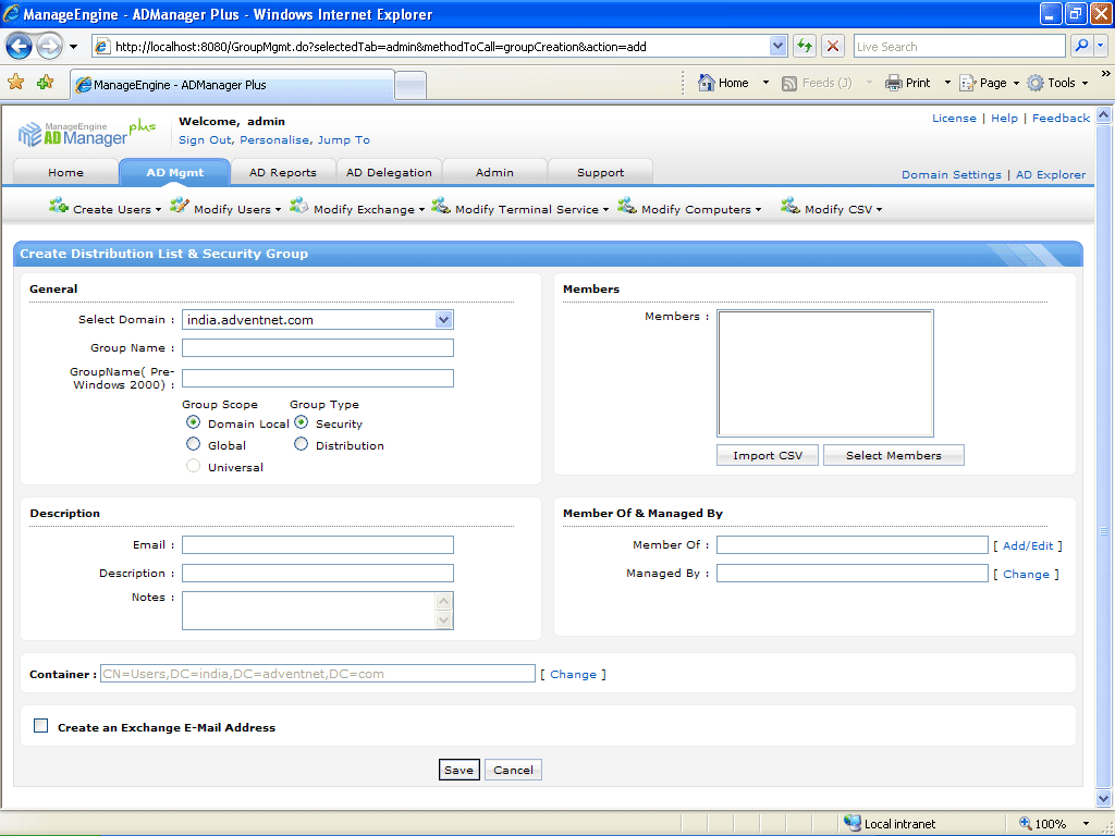 ADManager Plus has an exclusive feature dedicated for Group Management that simplifies creating and managing of Security and Distribution Groups in Active Directory. You can add/remove multiple group members, define various attributes, configure exchange attributes and do bulk import from a CSV file at a single instance.