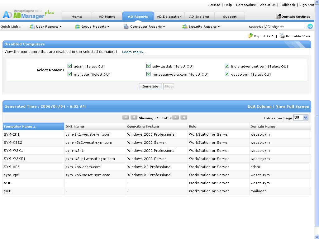 The Active Directory Computer Reports provide administrators a complete insight on the computer objects in the domains. With these reports that can also be scheduled, you can be free from the hassle of having to write scripts to manually fetch all computer specific information that you need.