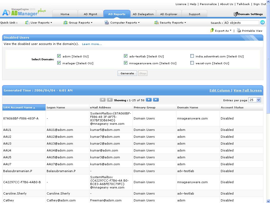 ADManager Plus with its built-in Delete, Disable, Move feature helps administrator to maintain the status of Active Directory accounts up to date. You can delete, disable or move the single/bulk accounts at one instant by selecting them from any one of the User or Computer Reports. See How to move users account
