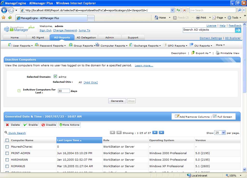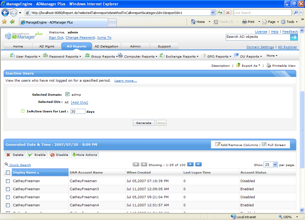 Administrator can generate inactive users or computers, disabled or expired accounts and manage them from the reports itself by disable, delete, enable or move the User or computer accounts to a differtent OU.