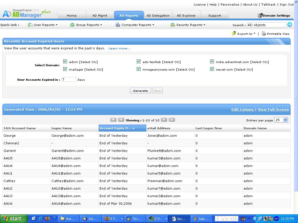 Active Directory user accounts that have gone obsolete for a long time might have expired without either the user or administrator knowing about them. Writing a script to find expired accounts can be tedious, ADManager Plus report generator scans the Active Directory and gives you a list of all expired accounts. From the result page, enabling you to proactively secure the network by deleting users or disabling users or move expired users to least privileged OU. You can also print and export Locked out Users results data to XLS, CSV, PDF, HTML, etc.