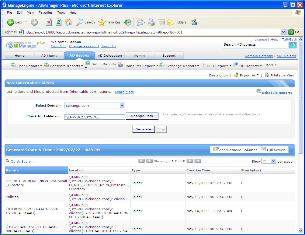 It is extremely important for administrators to protect the inheritable permissions associated with vital folders and directories. ADManager Plus generates NTFS reports on non-inheritable folders which lists the folders and files protected from inheritable permissions. With this Windows NTFS Security Report, an administrator can keep track of vital folders or directories and ensure that security is not compromised due to inheritance. This serves as windows file permissions tool as it helps in analyzing the inheritance permissions of folders and hence contributing to the security.
