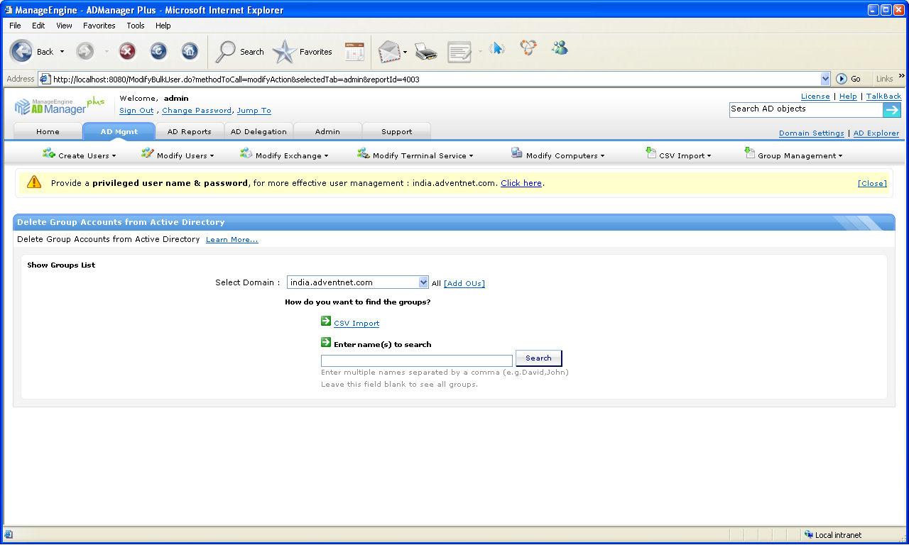 ADManager Plus allows administrator to delete active directory groups in bulk instead of deleting them one by one using the native Active Directory.