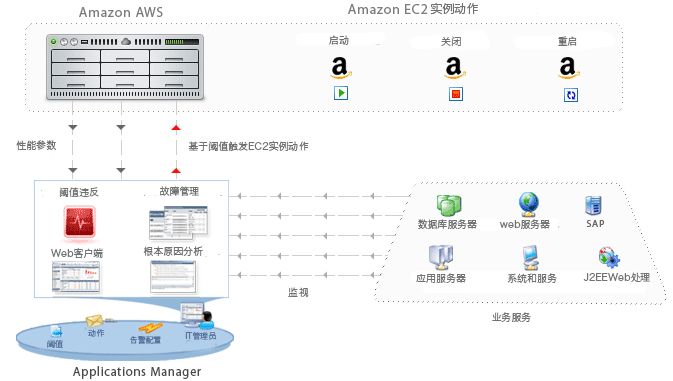 例如,當(dāng)一個(gè)Tocmat服務(wù)器的活動(dòng)回話數(shù)超過(guò)了設(shè)定的閾值,Applications Manager可以自動(dòng)啟動(dòng)/關(guān)閉/重啟Amazon EC2實(shí)例來(lái)實(shí)現(xiàn)資源調(diào)整。
