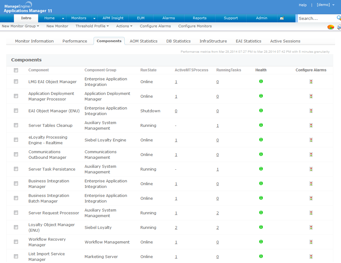 - Monitor all the tasks and processes in the Siebel App server, including custom components and task count essential to keep the application up and running.