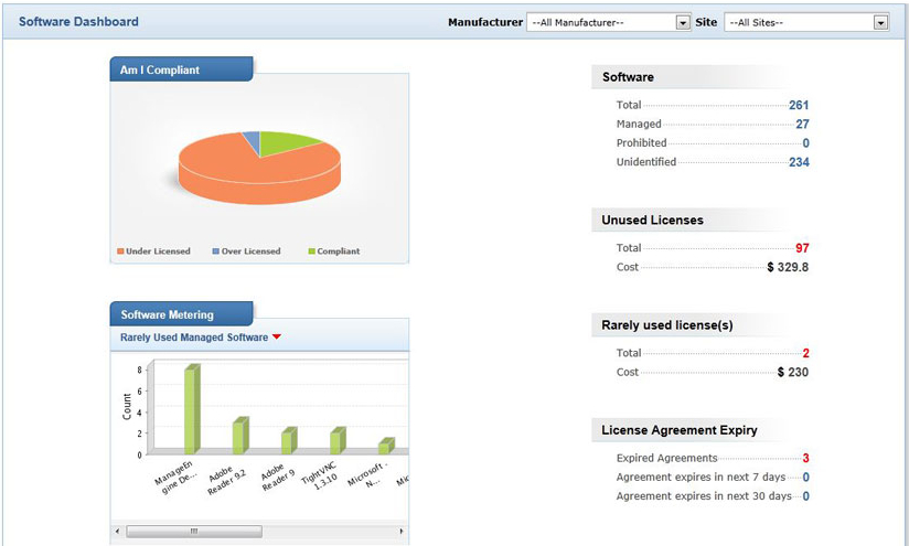 系統(tǒng)能夠跟蹤所有軟件資產(chǎn)以及軟件許可,可根據(jù)軟件類型、許可類型、廠商名稱等對軟件進行分組。系統(tǒng)通過動態(tài)可視化圖表直觀呈現(xiàn)企業(yè)網(wǎng)絡(luò)中軟件的合規(guī)性。