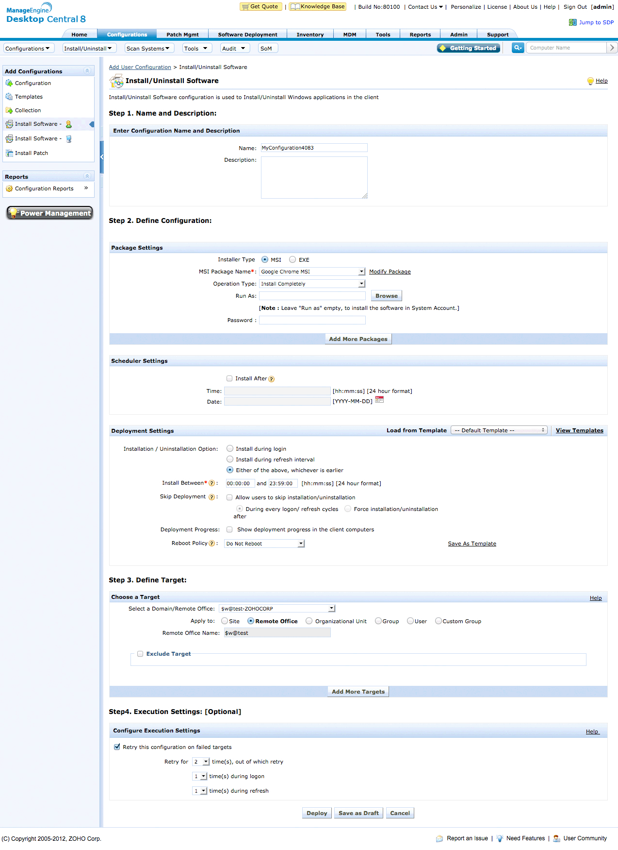 Desktop Central's Windows Installer feature improves the administrator's productivity by supporting remote MSI & EXE software/application deployment. Desktop Central can automatically install MSI & EXE software to users or computers at a scheduled time. Desktop Central supports software installation to users and computers or mass installation to OUs, Domains and Sites.