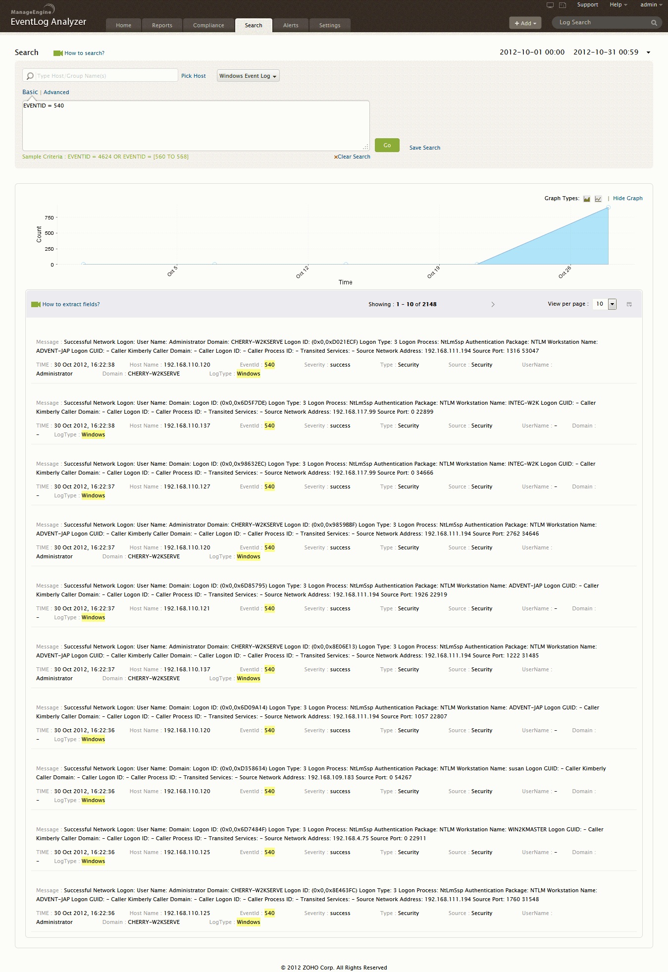 EventLog Analyzer makes forensic investigation very easy by allowing you to use its powerful log search engine to search on both the raw and formatted logs and instantly generate forensic reports based on the search results. This log forensics software enables network administrators to search the raw logs to pinpoint the exact log entry which caused the security activity, find the exact time at which the corresponding security event had happened, who initiated the activity and also, the location from where the activity originated.