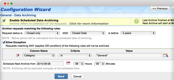 允許設(shè)置例外條件。例如:您可以設(shè)置將已關(guān)閉的2個(gè)月之前的數(shù)據(jù)歸檔,但是對優(yōu)先級為“高”的數(shù)據(jù)不歸檔。這里的“已關(guān)閉”和“2個(gè)月之前”就是歸檔條件,而“優(yōu)先級為高”則是例外。