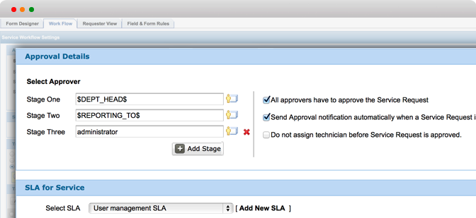 配置審批流程、設置SLA服務級別、自動指派技術員、管理任務等。