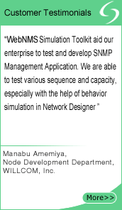 WebNMSWebNMS網(wǎng)絡(luò)模擬器給我們帶來了巨大的幫助,我們可以在行業(yè)展會、內(nèi)部測試和客戶部署時演示我們的管理軟件。我們選擇WebNMS Simulation Toolkit的主要原因是其靈活性、易于設(shè)計和創(chuàng)建網(wǎng)絡(luò)、熱情的技術(shù)支持以及經(jīng)濟的價格。另外,具備如拓?fù)渚庉嬈、網(wǎng)絡(luò)記錄環(huán)境以及實時網(wǎng)絡(luò)情景模擬等強大的功能,確實是測試網(wǎng)絡(luò)管理軟件理想的工具。"